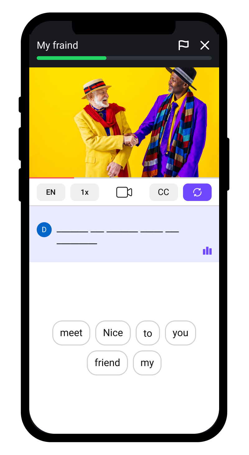 First, you’ll watch short, interesting movie clips. After watching, the fun begins with a game! In the game, you’ll fill in missing words, listen carefully, and speak aloud to practice what you’ve learned.